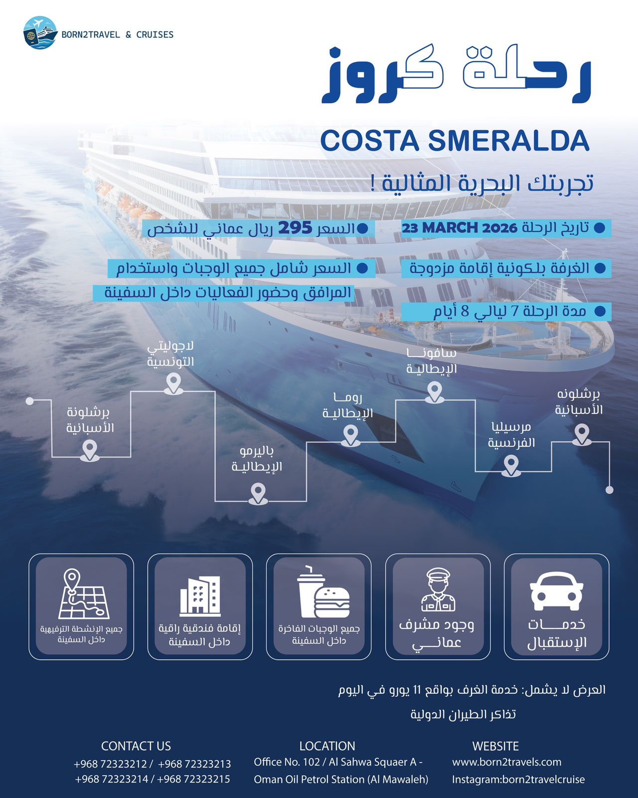 رحلة كروز العيد 7 ليالي / 8 أيام من المتعة على السفينة COSTA SMERALDA مسار الرحلة برشلونة – إسبانيا لاجوليتي – تونس...التأشيرة الأمريكية